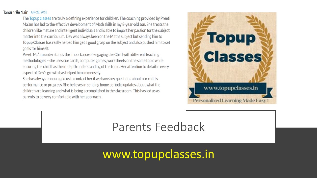 Click here to check our reviews on Google Maps. We pride ourselves on a customer-first and student-first approach. This reflects in our quality of assignments, homework and study material, class timings flexibility, and all the other little things that make parents happy to return to us year-after-year!! And tell their friends and family about their child’s growth with TopupClasses!