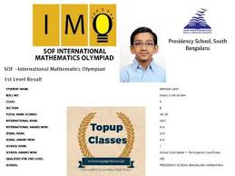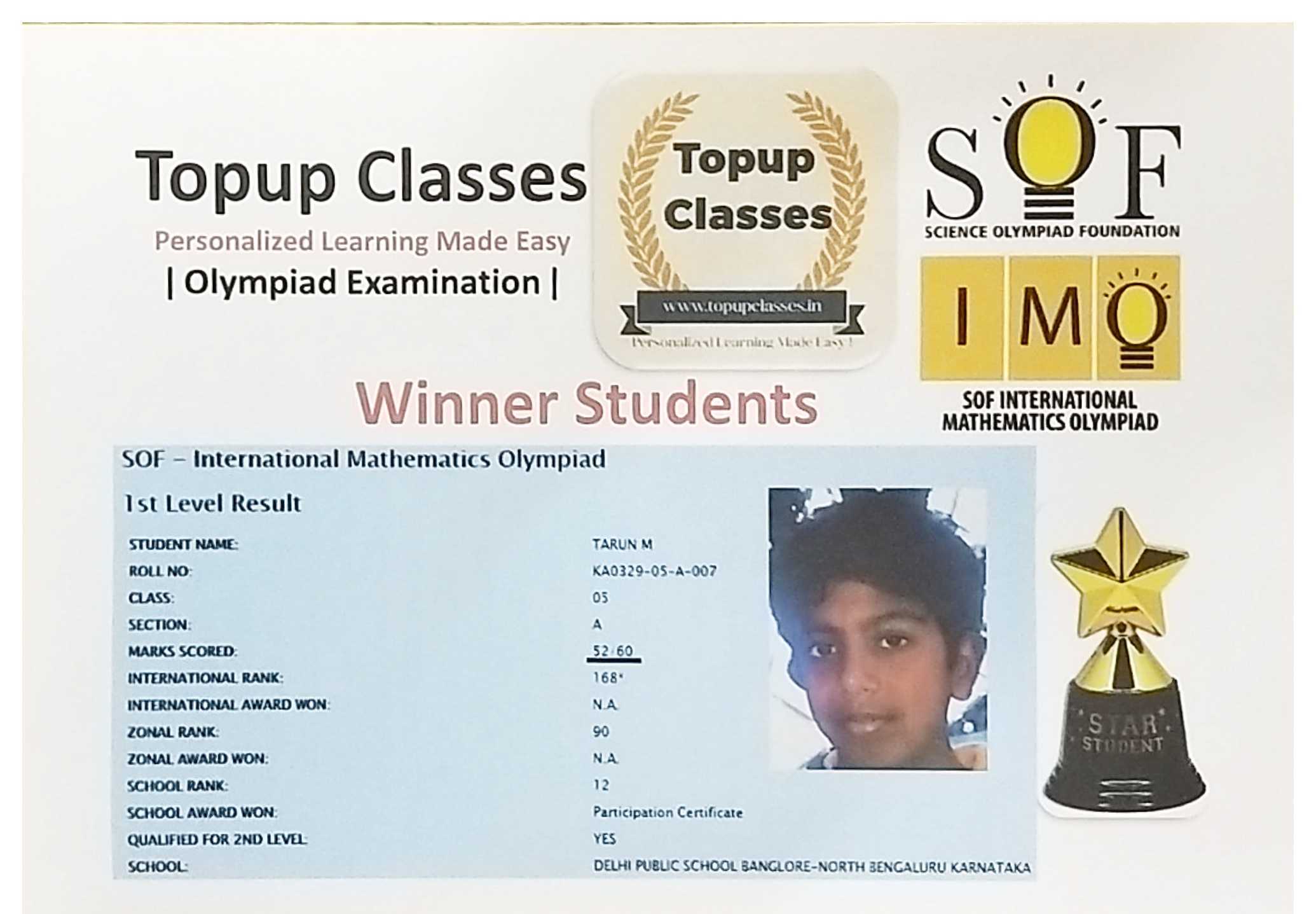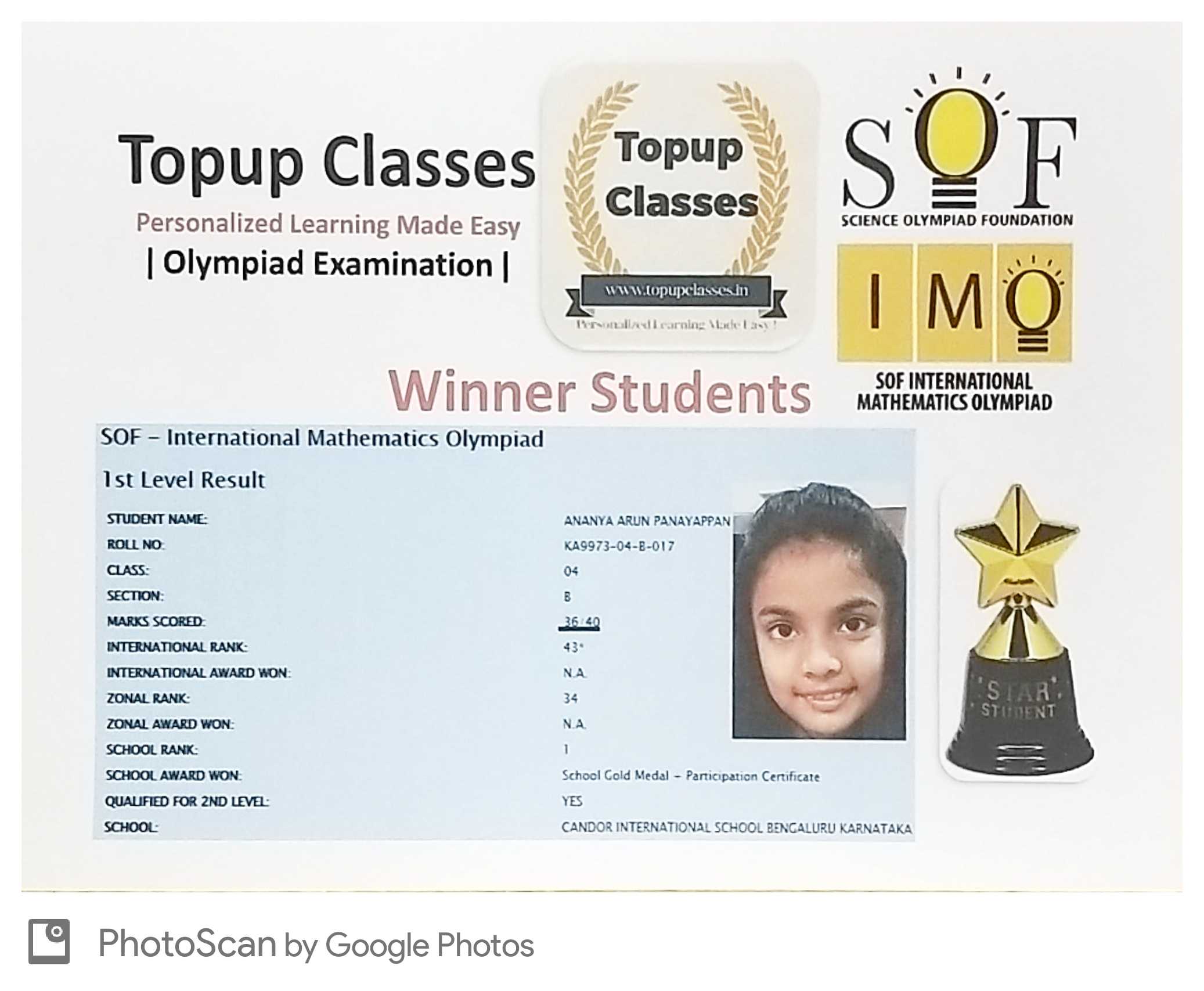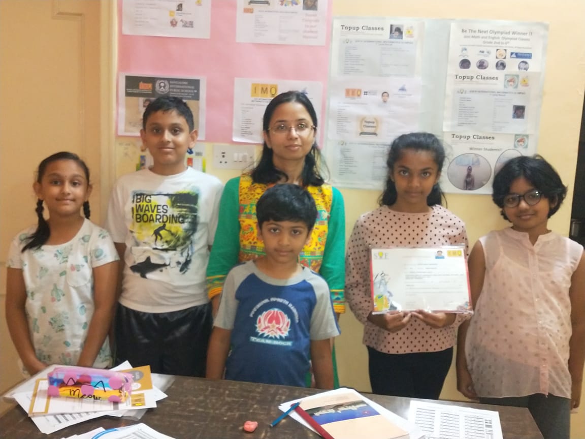 Topup Classes Preeti Principal Olympiad teacher has helped our kids in class 3,4 and 5. My kids qualified first time for International Mathematical Olympiad (IMO) level 2 as well and got gold medal for 1st Level,Top Achiever in International English Olympiad (IEO) with Gold Medal and certificate of Excellence.